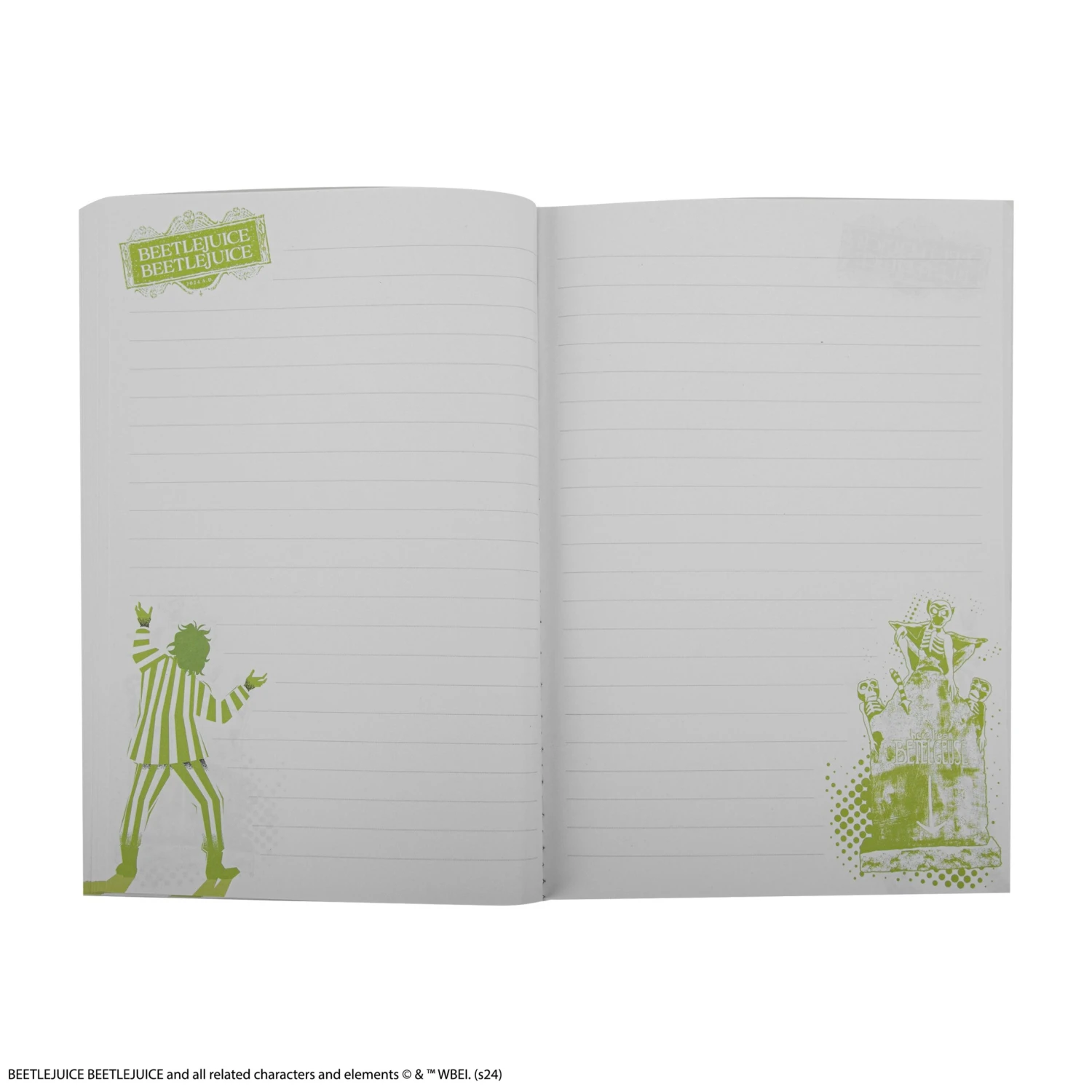 At the forefront, Beetlejuice himself stands tall, clad in his iconic black and white striped suit. Frozen in his signature pose, Beetlejuice brings a touch of the supernatural to this dark and eerie notebook.