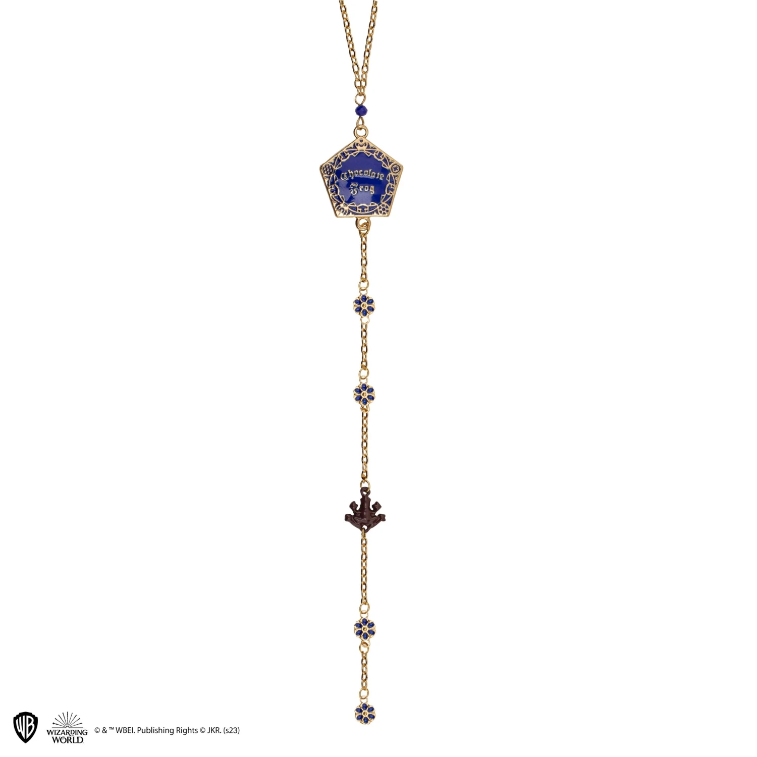 The necklace features a dainty gold chain necklace adorned with blue rhinestones, leading to a faithful replica pendant of the iconic Chocolate Frog box. Below, a singular gold chain gracefully extends, creating a captivating effect with delicate blue flowers and a small chocolate frog character.