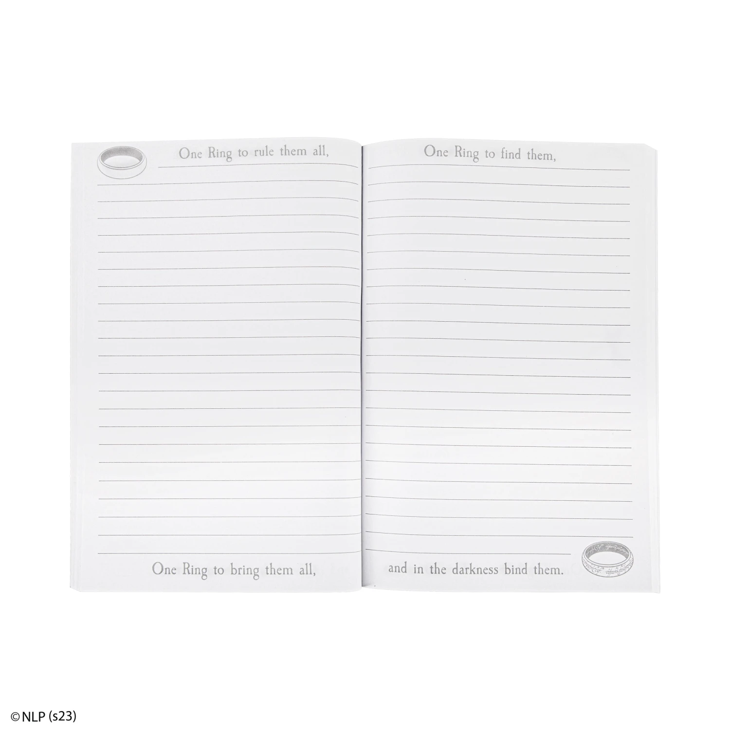 Inside you will find the lined pages with the phrase “One Ring to rule them all, One Ring to find them, One Ring to bring them all and in the darkness bind them.” on the top and bottom pages. Carry this notebook to keep your writings, ideas and notes safe.