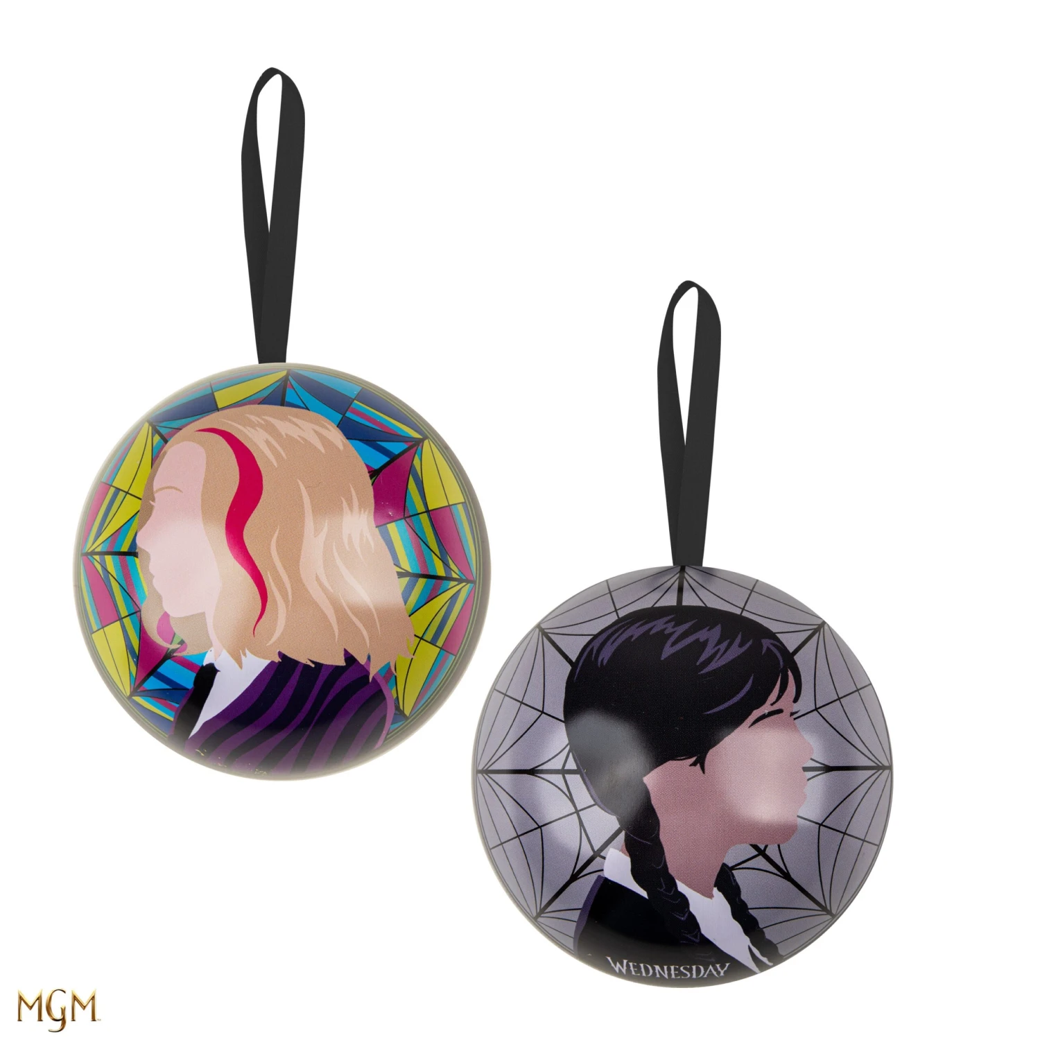 Dark elegance meets colorful joy with our Wednesday & Enid Holiday Capsule. On one side, find Wednesday against a backdrop of deep shadows, while on the other side, discover Enid’s vibrant charm set amidst a kaleidoscope of colors liker her side of the stained glass from their dorm room.