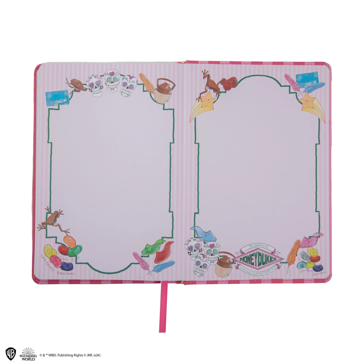 A delightful fusion of Honeydukes charm and customisable creativity. This unique notebook features a front cover, crafted from pink velcro, adorned with 19 patches inspired by the magical world of Honeydukes. From the Chocolate Frog to Jelly Slugs and Bertie Bott’s Every Flavor Beans, each patch exudes the sweet essence of Honeydukes.