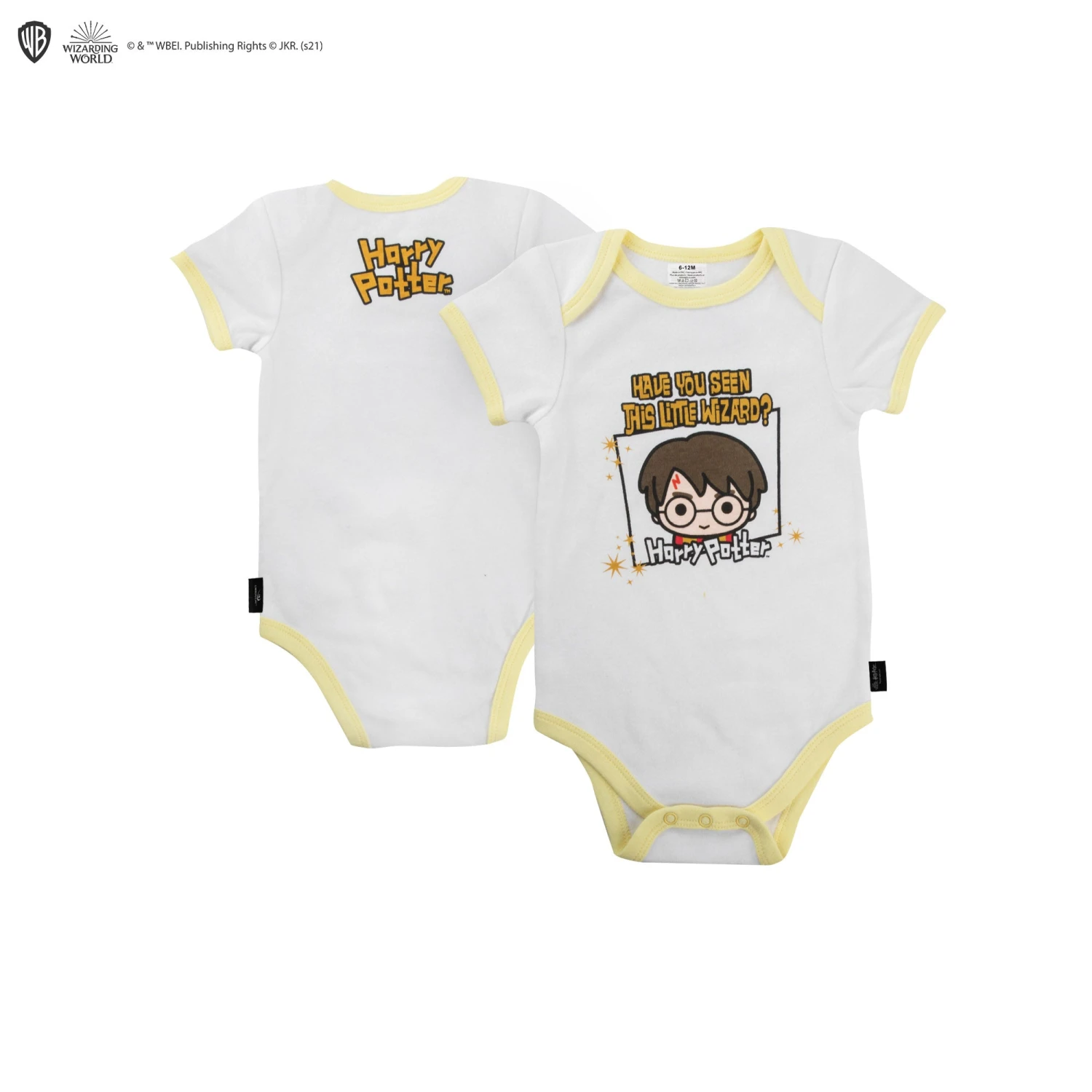 You can find a lot of details from the Wizarding World on these two pieces : Harry Potter in a poster reading “Have you seen this little wizard?” on the bodysuit and Harry Potter in his Quidditch outfit on the bib.