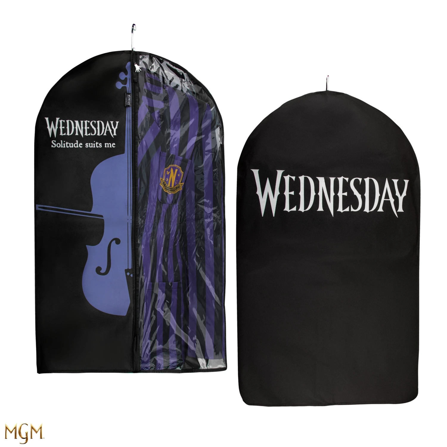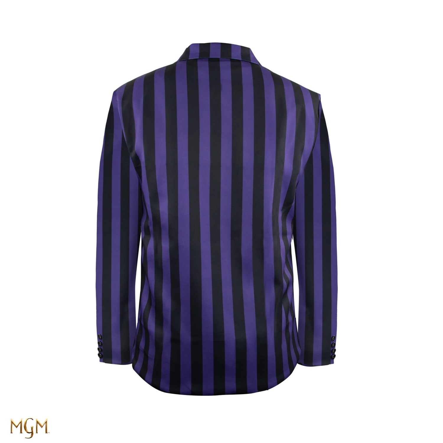 This purple blazer features the iconic Nevermore Academy logo, elegantly positioned on the left breast, while the entirety of the garment showcases a mesmerizing pattern of purple and black stripes, faithfully recreating the signature blazers worn by the student body in the show.