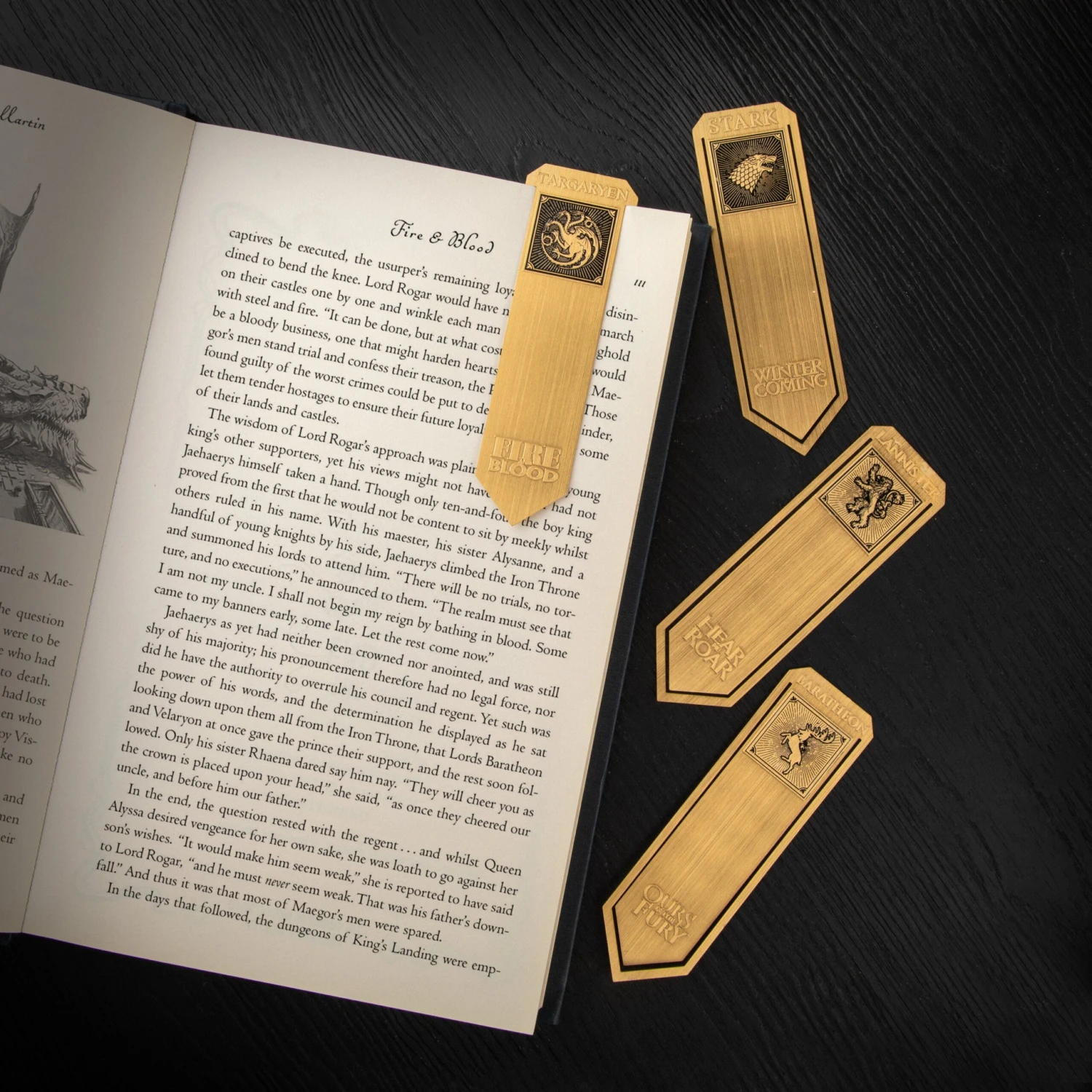 This set of 4 metal bookmarks regroups the four most important Houses in Game of Thrones: Stark, Targaryen, Lannister, and Baratheon. These bookmarks are designed to easily clip onto your favourite pages, ensuring that you never lose your place in the Westeros world.