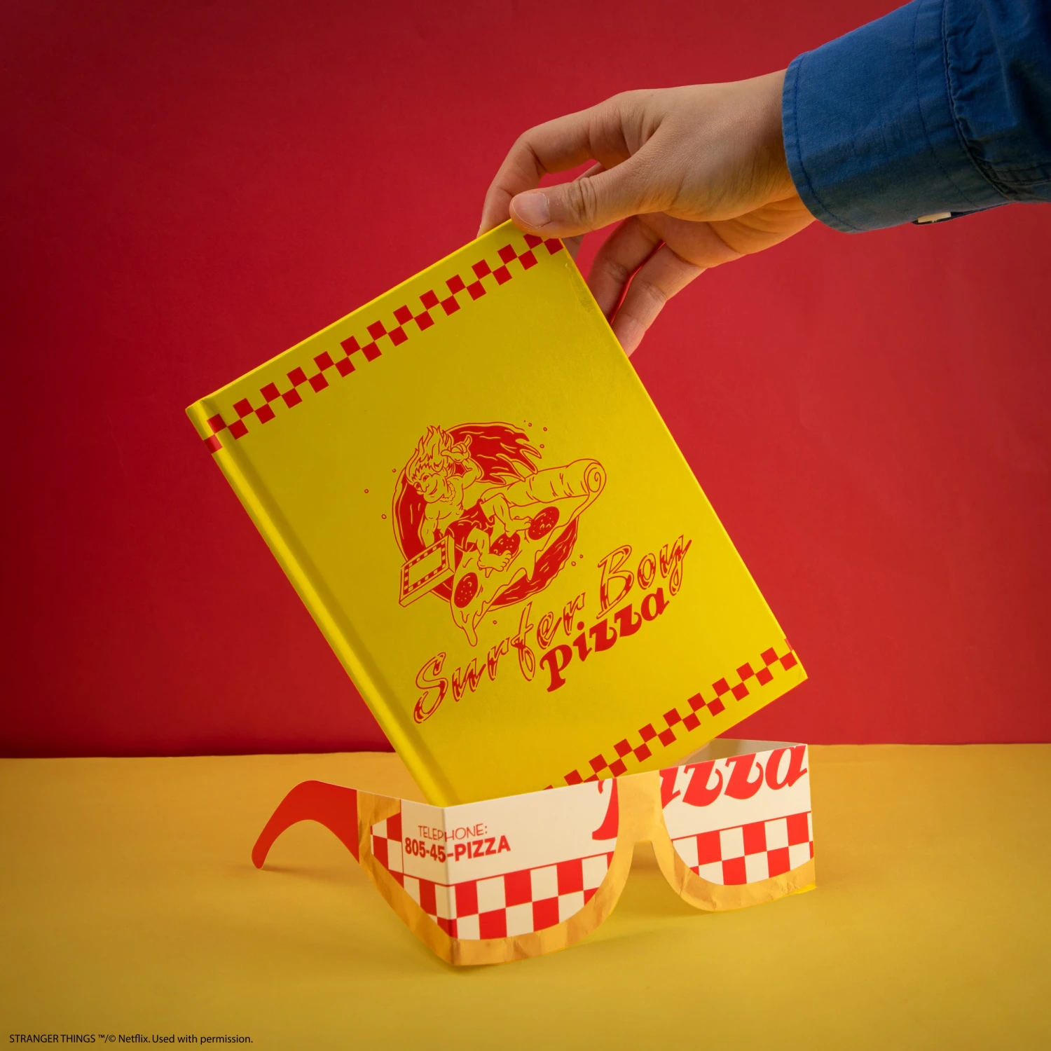 Enclosed within the hardcover, you’ll discover a pair of Eleven’s Pizza Goggles with lined paper throughout the notebook to help you jot down your dreams, doodles or even a secret pizza recipe.