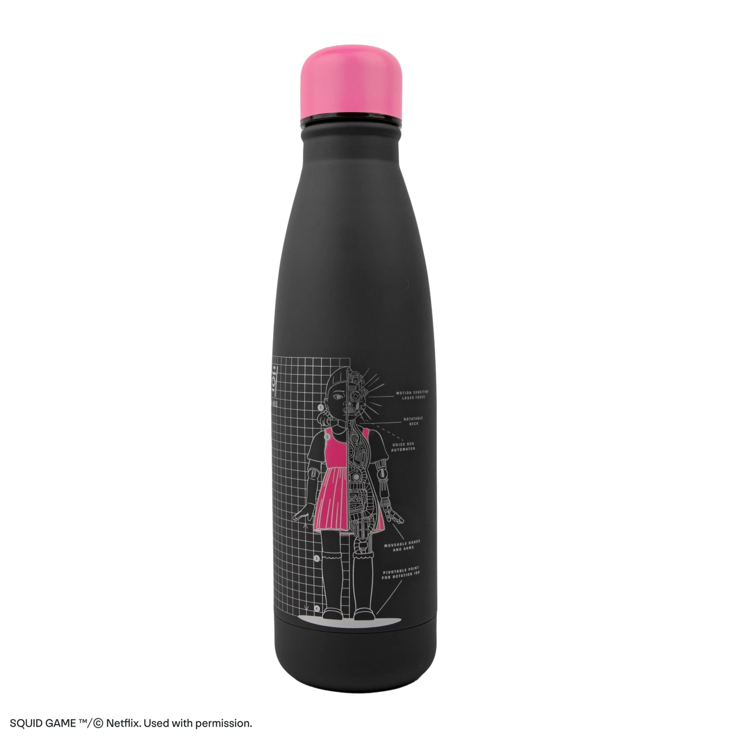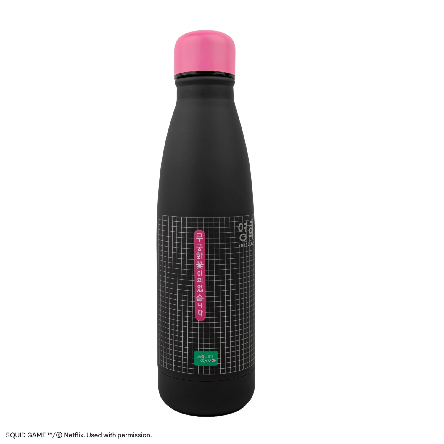 Whether you’re heading out or working at your desk, let the suspenseful charm of the Squid Game universe accompany you with every sip you take with this, Young-Hee Blueprint Black Water Bottle.