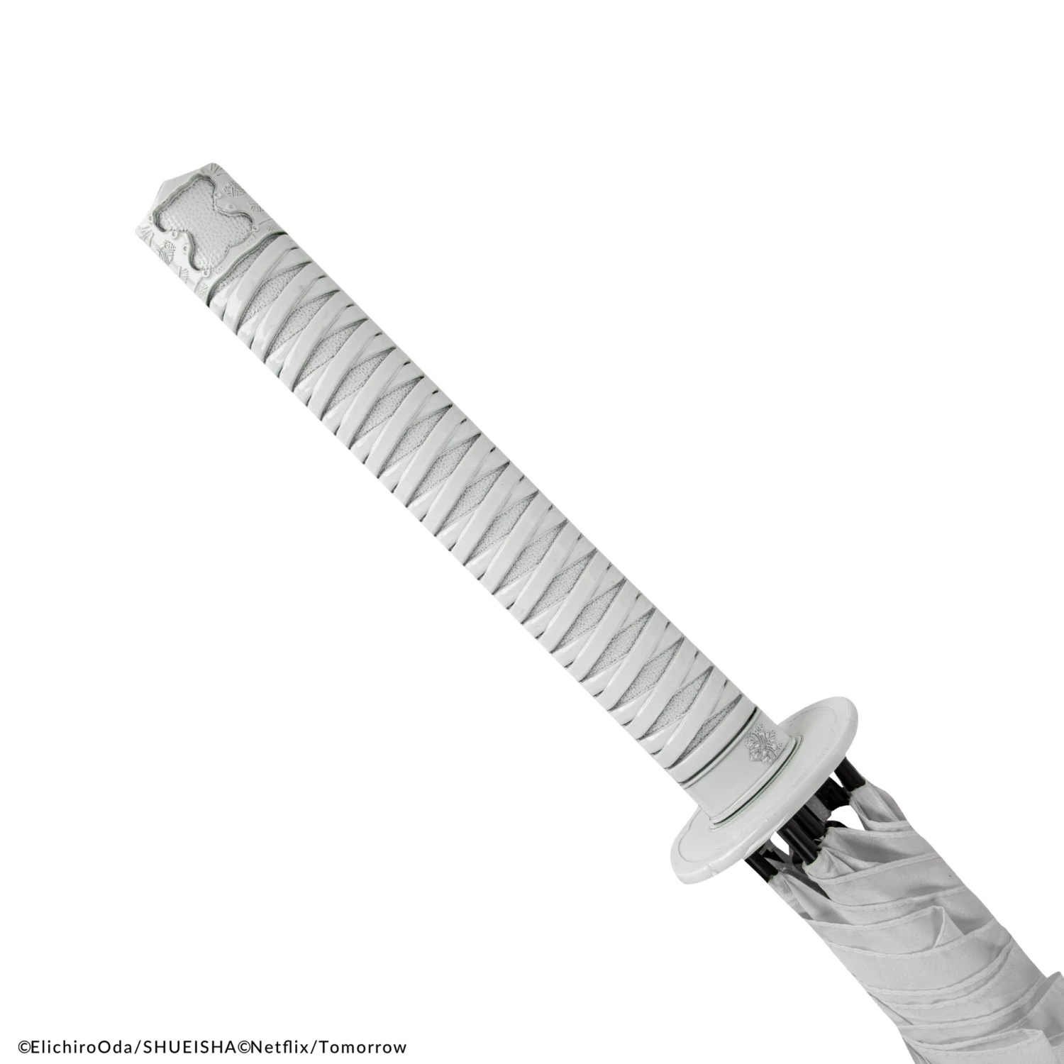 The legendary swordsman from One Piece, Roronoa Zoro, inspired the design of the white Zoro katana umbrella. This long sword umbrella has a katana-like design that not only provides ample coverage from rain and sun, but it is also a bold fashion accessory.